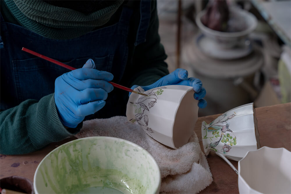 草花や水や雪の模様を筆やスポイトを用いて器に描き、